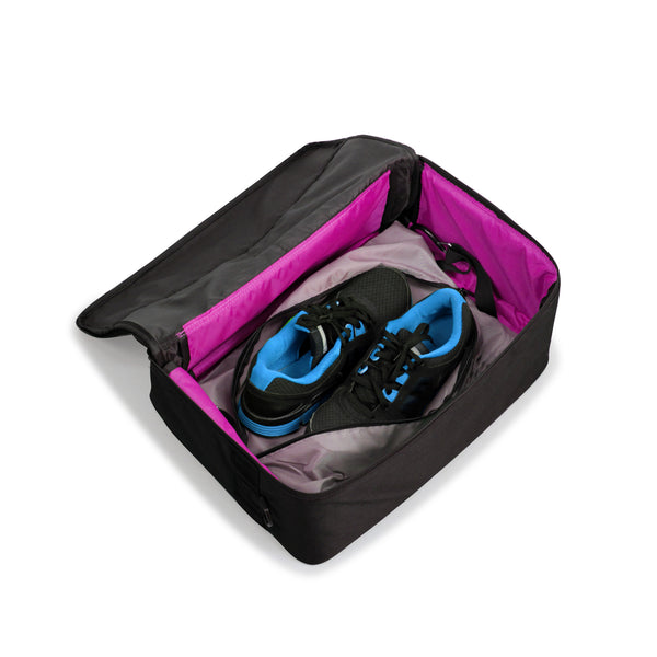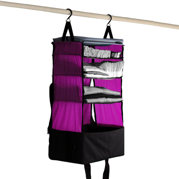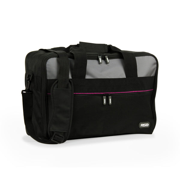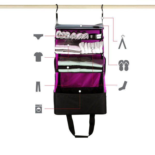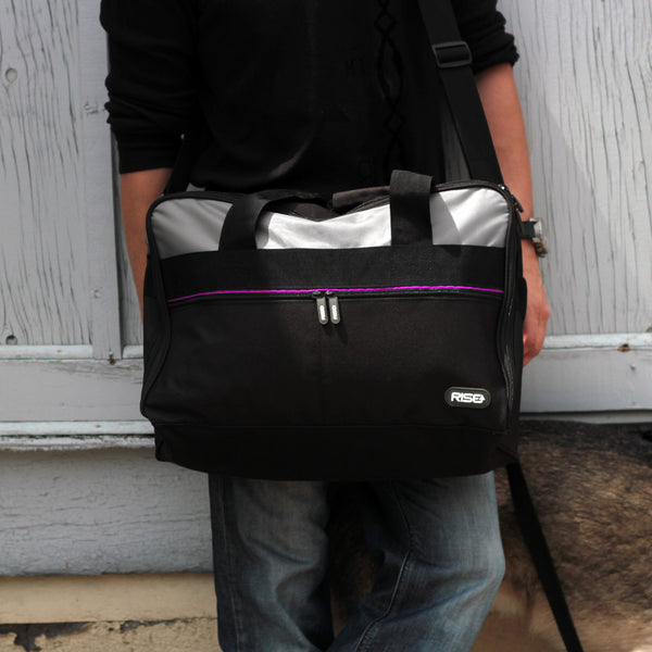 We designed the Rise Jumper Bag to be the perfect travel companion. It’s light, stylish, practical and versatile for the occasional right to the most demanding of travelers. It can be a carry on piece of luggage or easily packed in a rolling suitcase and checked in. It features our patent pending portable shelving system to keep your clothes folded and organized. The laundry compartment in the bottom is great for keeping clean clothes clean and the top shelf features an additional zippered pouch. The dual front pockets keep all your travel documents handy and easy to get to at all times. For even more convenience while going through the airport, you can use the suitcase extension holder to keep the Jumper bag riding on top of your rolling suitcase so that you don’t have to carry it.